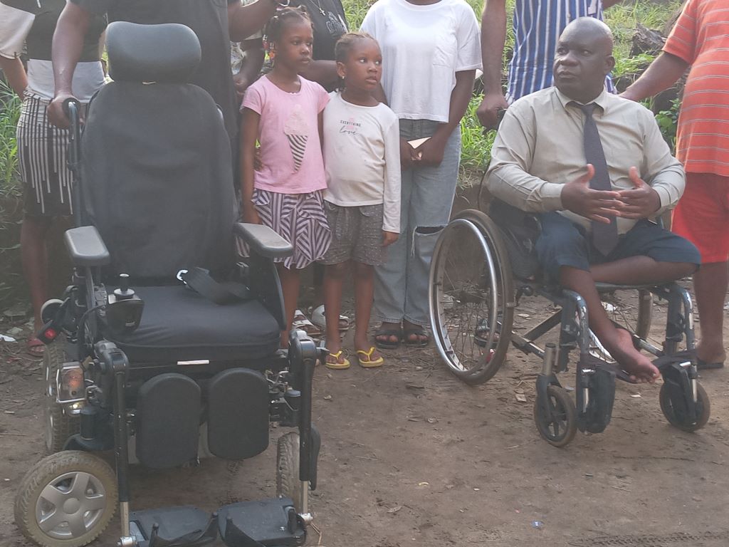 Cocody / Eric Taba offre un fauteuil roulant électrique à un habitant de la Sogefiha